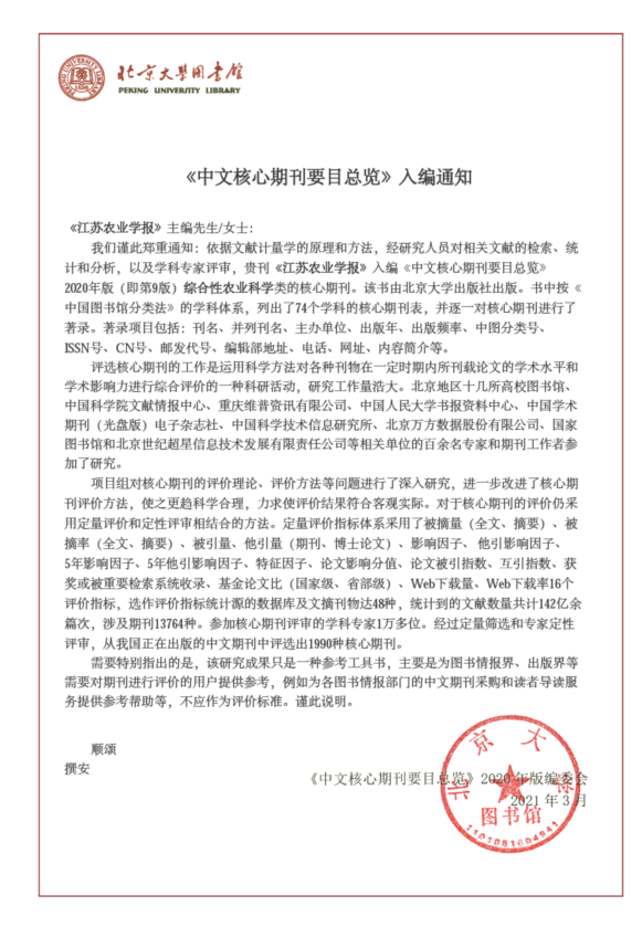 近日,我院主办的《江苏农业科学》收到《中文核心期刊要目总览》2020年版(第九版)编委会的入编通知,3年后再次入编全国中文核心期刊。《江苏农业学报》同时入编全国中文核心期刊。